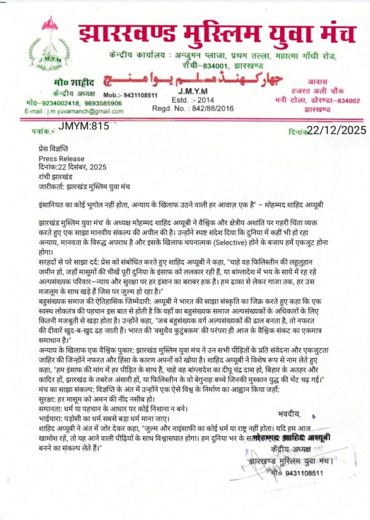 अन्याय के खिलाफ एक वैश्विक पुकार: झारखंड मुस्लिम युवा मंच ने उन सभी पीड़ितों के प्रति संवेदना और एकजुटता जाहिर की जिन्होंने नफरत और हिंसा के कारण अपनों को खोया है। शाहिद अय्यूबी ने विशेष रूप से नाम लेते हुए कहा, “हम इंसाफ की मांग में हर पीड़ित के साथ हैं, चाहे वह बांग्लादेश का दीपू चंद्र दास हो, बिहार के अतहर और कादिर हों, झारखंड के तबरेज अंसारी हों, या फिलिस्तीन के वो बेगुनाह बच्चे जिनकी मुस्कान युद्ध की भेंट चढ़ गई।”